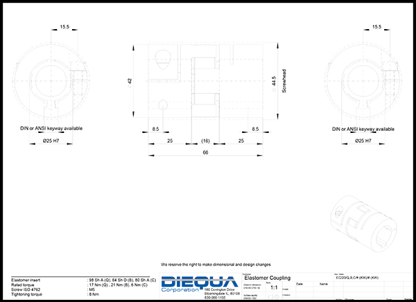 DieQua offers the EC Series Elastomer Jaw Couplings for those applications that require higher performance than typical insert couplings. These anti-backlash stainless steel jaw couplings provide zero backlash, several clamping styles, and five different insert types that provide varying degrees of torsional rigidity.